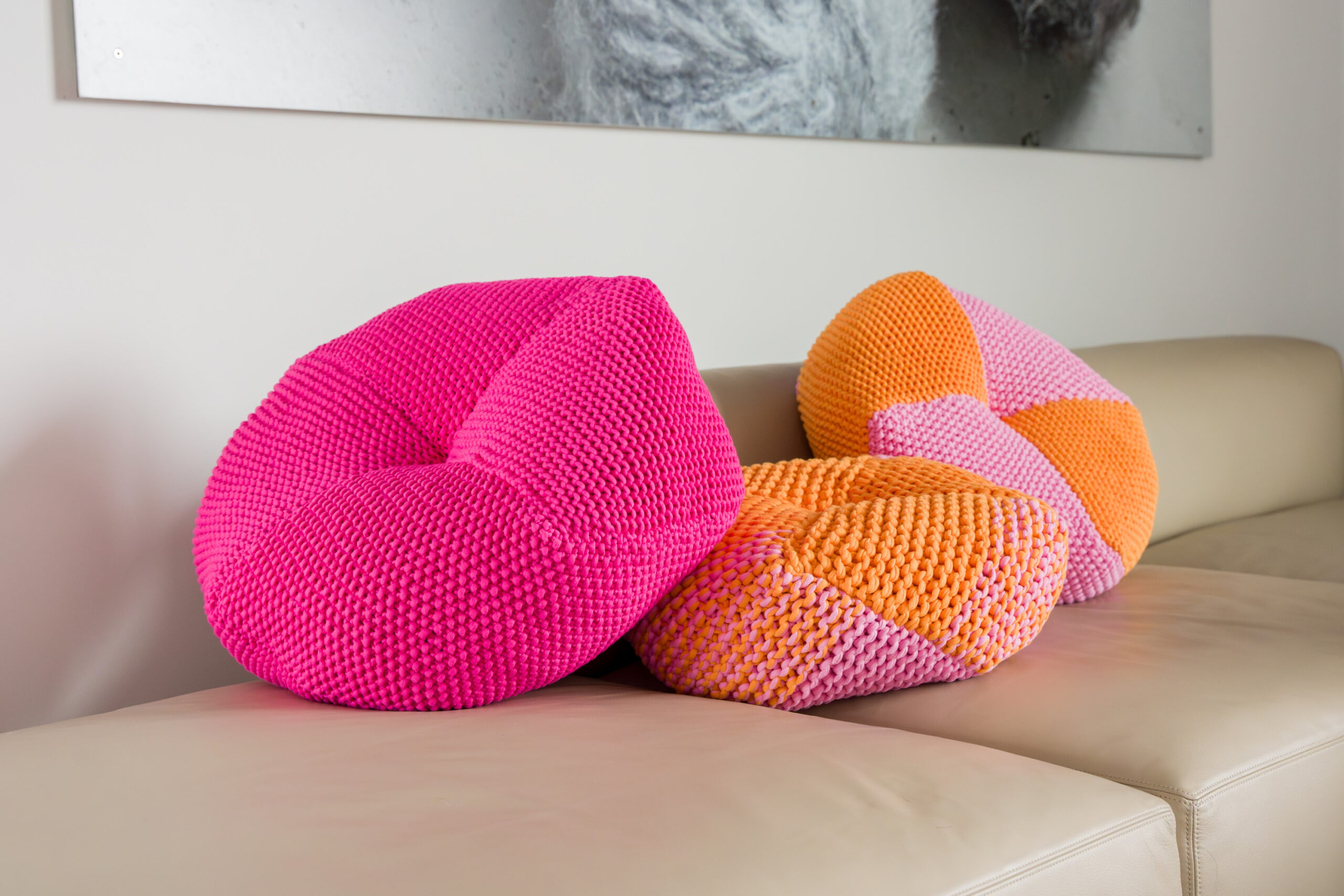 Nora hält hier das Kissen in Größe 2 in Händen, dafür werden je 400g The Tube von Lana Grossa in den Farben Orange (18) und Rosa (19) verstrickt. Foto: Felix Brunnbauer mit Nora