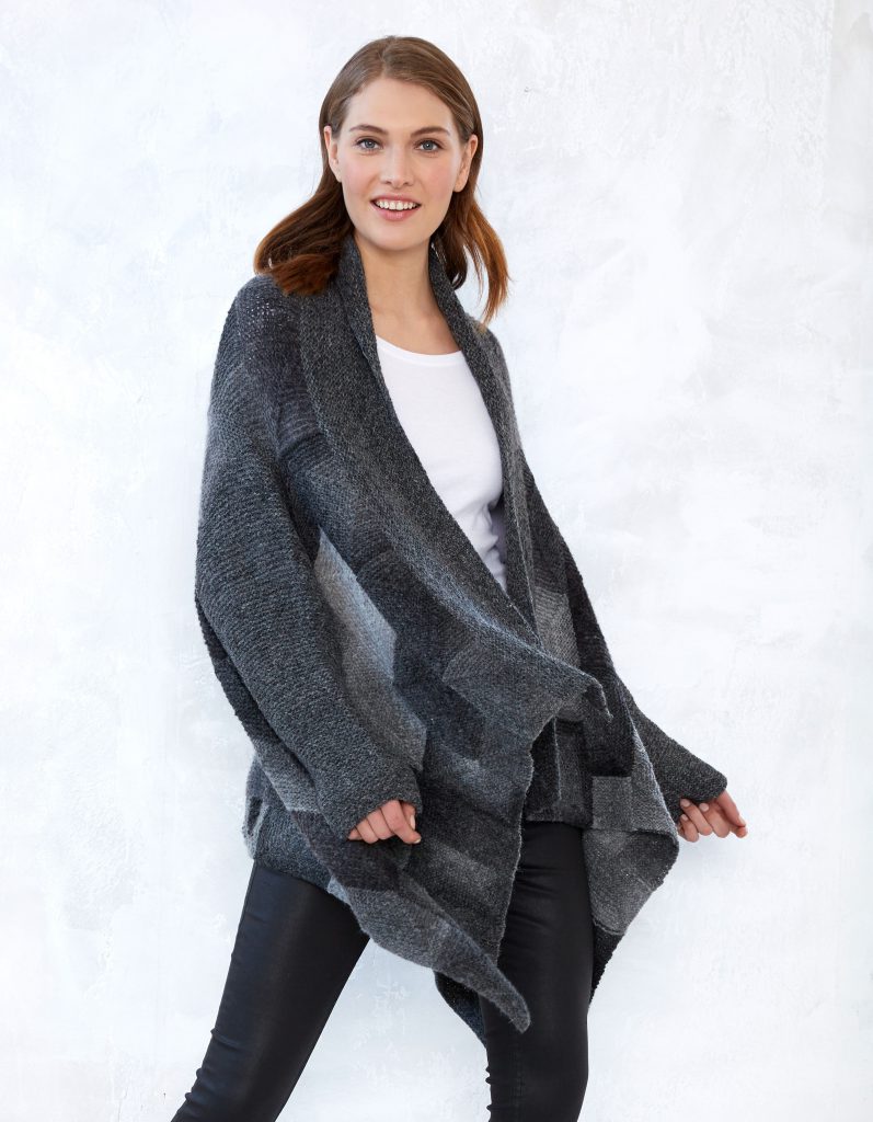 Der #piecefulCardigan, gestrickt aus Schachenmayr den mix&knit Garnen Soft Mix, Pieces (14 Knäuel in Farbe 499 und 8 Knäuel in Farbe 398) + Soft Mix (3 Knäuel in Farbe 199)
