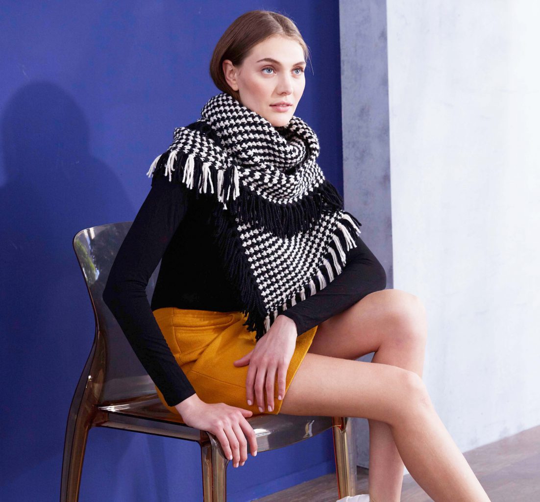 Gestricktes Dreieckstuch aus Schachenmayr Cordelo (250g in Farbe 99 Schwarz, 200g in Farbe 02 Wollweiß), Anleitung ab 05.09.2017 hier und auf der ARD Buffet Seite verfügbar! Foto: Olaf Szczepaniak