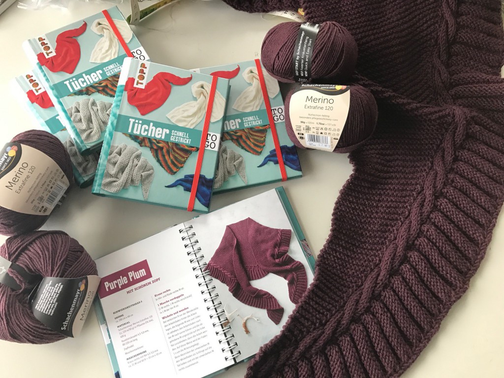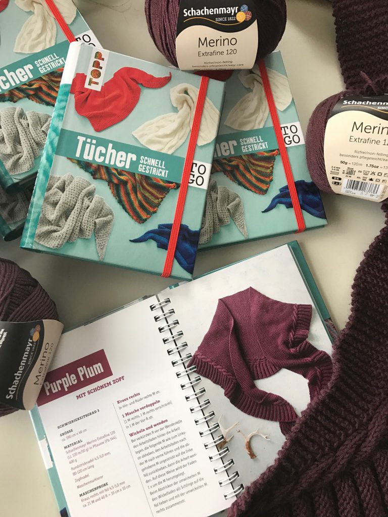 Und da ich netterweise so viele Bücher vom Verlag erhalten habe, verlose ich natürlich auch gerne 4 Exemplare von dem Buch „Stricken to go: Tücher“ und auch ein Materialpaket mit 400g Merino Extrafine 120 von Schachenmayr in der großartigen Farbe 144 Pflaume – und ratet mal, welches Modell man damit Stricken könnte… 🙂