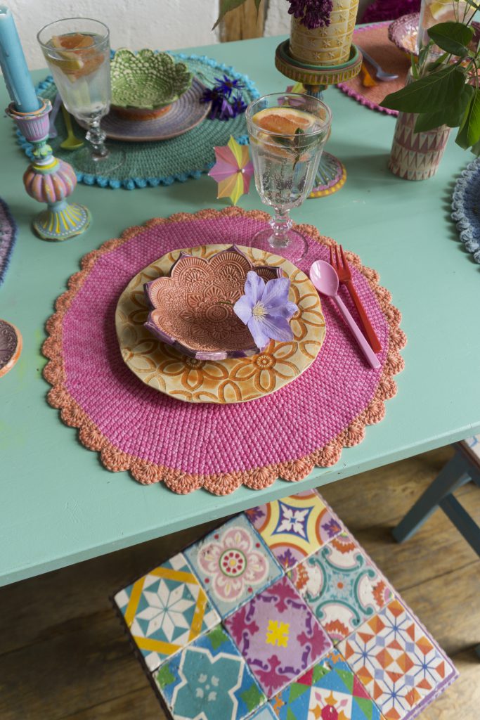 12. Juni 2016 683 × 1024 Tischset pink_7 Gehäkelte Tischsets aus Catania Denim, Idee für die bunten Hocker-Fliesen: Patricia Morgenthaler, Foto & getöpfertes Geschirr: Bine Brändle
